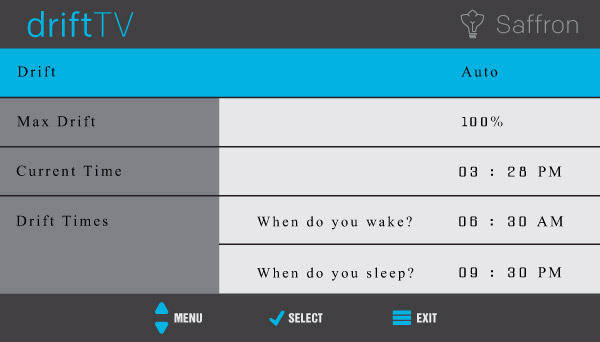 You can set how much blue you want to take out. For example, you can set your Drift TV to remove 50% (or any percentage in increments of 10%) of all blue light over a period of 1 hour. That way, the transition is seamless and virtually unnoticeable.